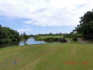 No.1 411yds 右に池、左がOBのパ-4